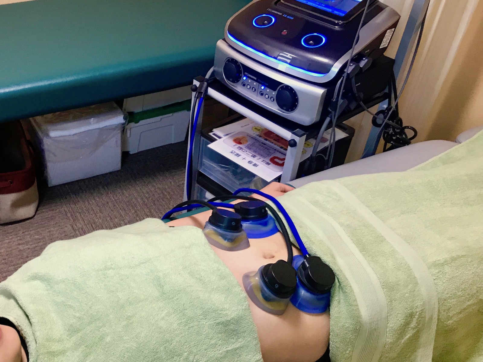 主に、低周波電気治療を施します。腸の動きに合わせて電気刺激を与えることで腸の動きが活発になり便秘改善や痩身効果があります。